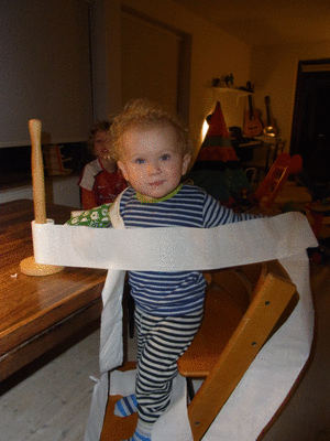 Milans værelse er kommet i brug, og det er han rigtig glad for. Han siger A deeeet? (Hvad er det?) konstant, så vi er på overarbejde med at svare ham. Vi forsøger at oplære Halfdan, så han kan aflaste i opremsningen af mælk, bord, gulv, kop, loft, stol, mælk, mælk, mælk, mælk ... Han siger også tak (tak-tak-tak-tak), når han afleverer noget til os, og hver morgen, når han synes han har ventet længe nok på at sovetrynen Halfdan skal komme ud af fjerene, står han ude ved hoveddøren og banker og siger Dåw-de (Dorte), som er en af pædagogerne i vuggestuen.